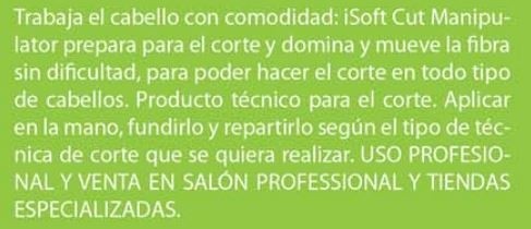 Trabaja el cabello con comodidad: iSoft Cut Manipulator prepara para el corte y domina y mueve la fibra sin dificultad, para poder hacer el corte en todo tipo de cabellos. Producto técnico para el corte. Aplicar en la mano, fundirlo y repartirlo según el tipo de técnica de corte que se quiera realizar. USO PROFESIONAL. Comodidad: iSoft Cut Manipulator prepara para el corte y domina y mueve la fibra sin dificultad, para poder hacer el corte en todo tipo de cabellos. Producto técnico para el corte. Aplicar en la mano, fundirlo y repartirlo según el tipo de técnica de corte que se quiera realizar. Prepara para el corte y domina y mueve la fibra sin dificultad, para poder hacer el corte en todo tipo de cabellos. Producto técnico para el corte.