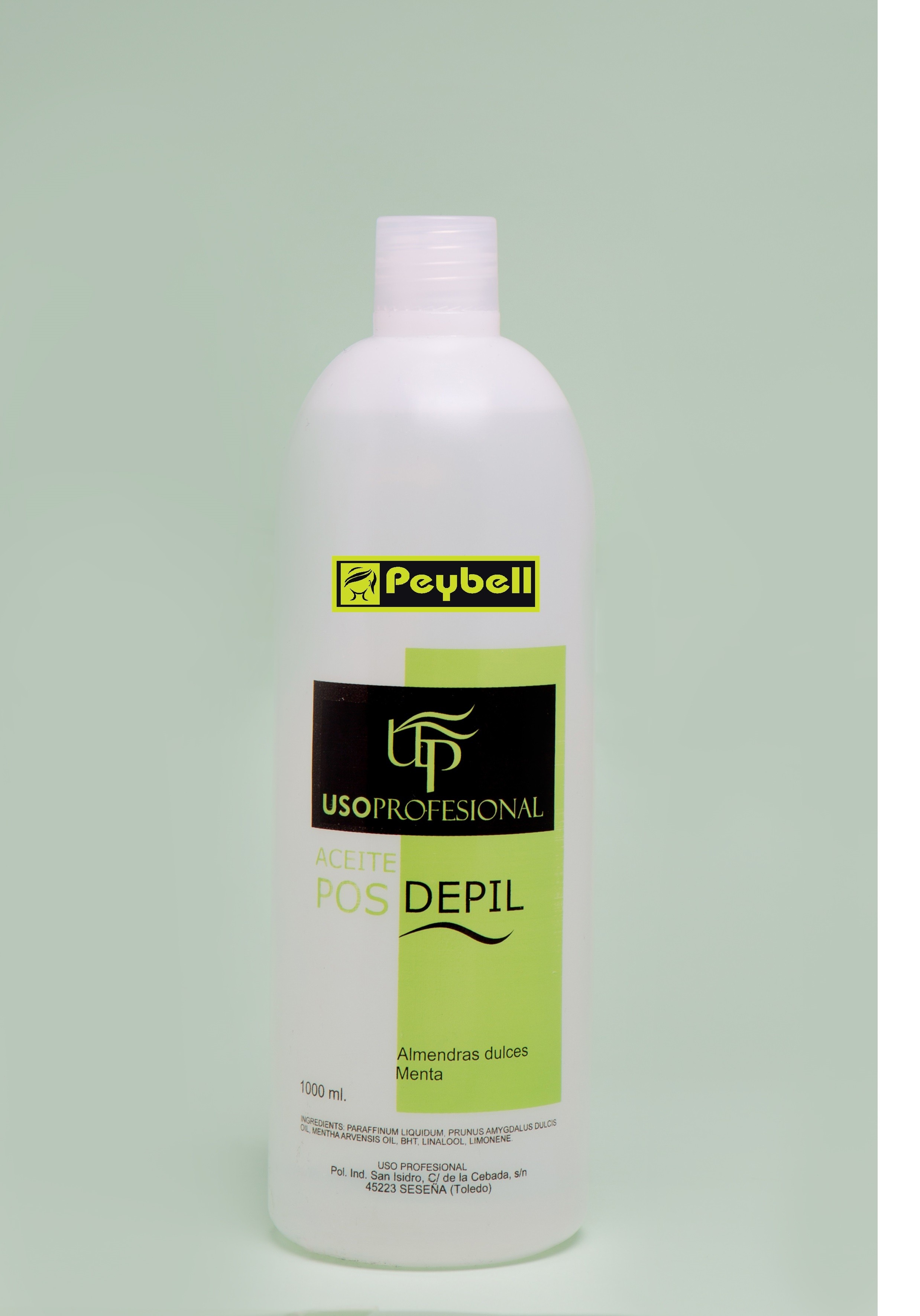 Aceite especial para después de la depilación de Uso Profesional a base de manzanilla, menta y uva. Presentación en envase de plástico de 1000 ml. con dosificador.
